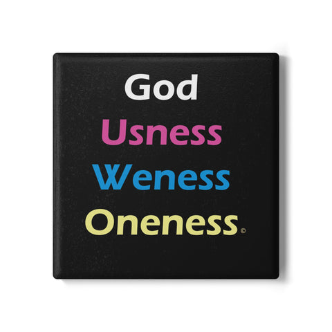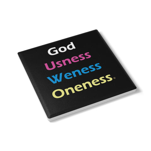 God, Usness, Weness, Oneness. These are not just coasters this is is an affirmation a reminder, an eternal truthful spiritual message from the soul. With the simple, powerful phrase; God, Usness, Weness, Oneness. © words and design Whether you’re deep in reflection while sipping tea or just enjoying your daily life these coasters are a beautiful blend of text design and spiritual truth. These ceramic coasters come with a non-slip, cork backing and are perfect for enjoying hot or cold drinks while protecting your table from spilling accidents. They are easy to wipe clean and come in two shapes; round and square. * Made from ceramic and cork * Size (Round): 4.06'' x 4.06'' (10.3 cm x 10.3 cm) * Size (Square): 3.94'' x 3.94'' (10 cm x 10 cm) * Suitable for hot or cold drinks * Non-slip cork backing *Easy to wipe clean